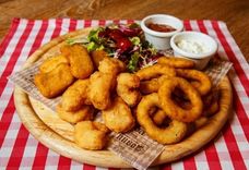 410/165 г • Хрустящие жареные панированные луковые колечки, куриные наггетсы, панированные креветки, подаются с соусами тартар и 1000 островов, томатами Черри и миксом свежих салатов