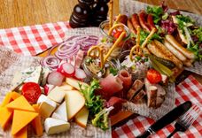 1260 г • Ломтики сырокопченой ветчины, колбаса, соленое сало, фирменные сосиски из свинины и говядины, ароматный Швайнфляйш, сырный паштет Обацда, Смалец, паштет из говяжьей печени, сыры: с голубой плесенью, копченый, чеддер, свежий редис, томаты черри, фирменный Бородинский хлеб собственной выпечки