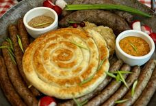 1050/365 г • Ассорти из фермерских колбасок со свининой и говядиной, куриная улитка с сыром. Подается с гарниром из квашеной белой капусты, свежего редиса, со сладкой баварской и острой дижонской горчицей