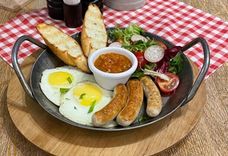 300 г • Глазунья с Нюрнбергскими колбасками, легким овощным салатом и нашей фирменной аджикой