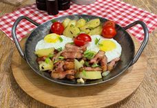 315 г • Глазунья, зажаренная с картофелем по-домашнему, грудинкой и луком