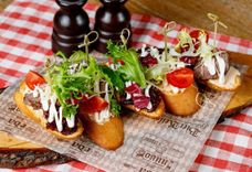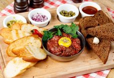 155/140/75 г • Фирменная закуска из сырой рубленой говядины, заправленной ароматными специями. Подается на большой деревянной доске с гренками из свежевыпеченного хлеба