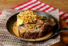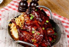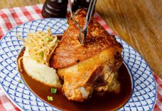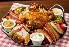 2250/1100 г • Огромное мясное блюдо для компании на любой вкус: запечённая свиная рулька, половина запеченной утки, запечённая свиная шея Швайнфляйш, колбаски из свинины и говядины. Подаётся на большой сковороде с гарниром из тушёной белой капусты, жареным картофелем, острой дижонской горчицей и хреном
