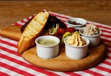 250 г • Баварские бутерброды на запеченном до хрустящей корочки багете с сырной обацдой, мармеладом из красного лука и ростбифом деликатного приготовления