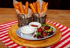 270/165 г • Хрустящие палочки из сыра, бекона и лука подаются с соусами тартар и 1000 островов, томатами Черри и миксом свежих салатов